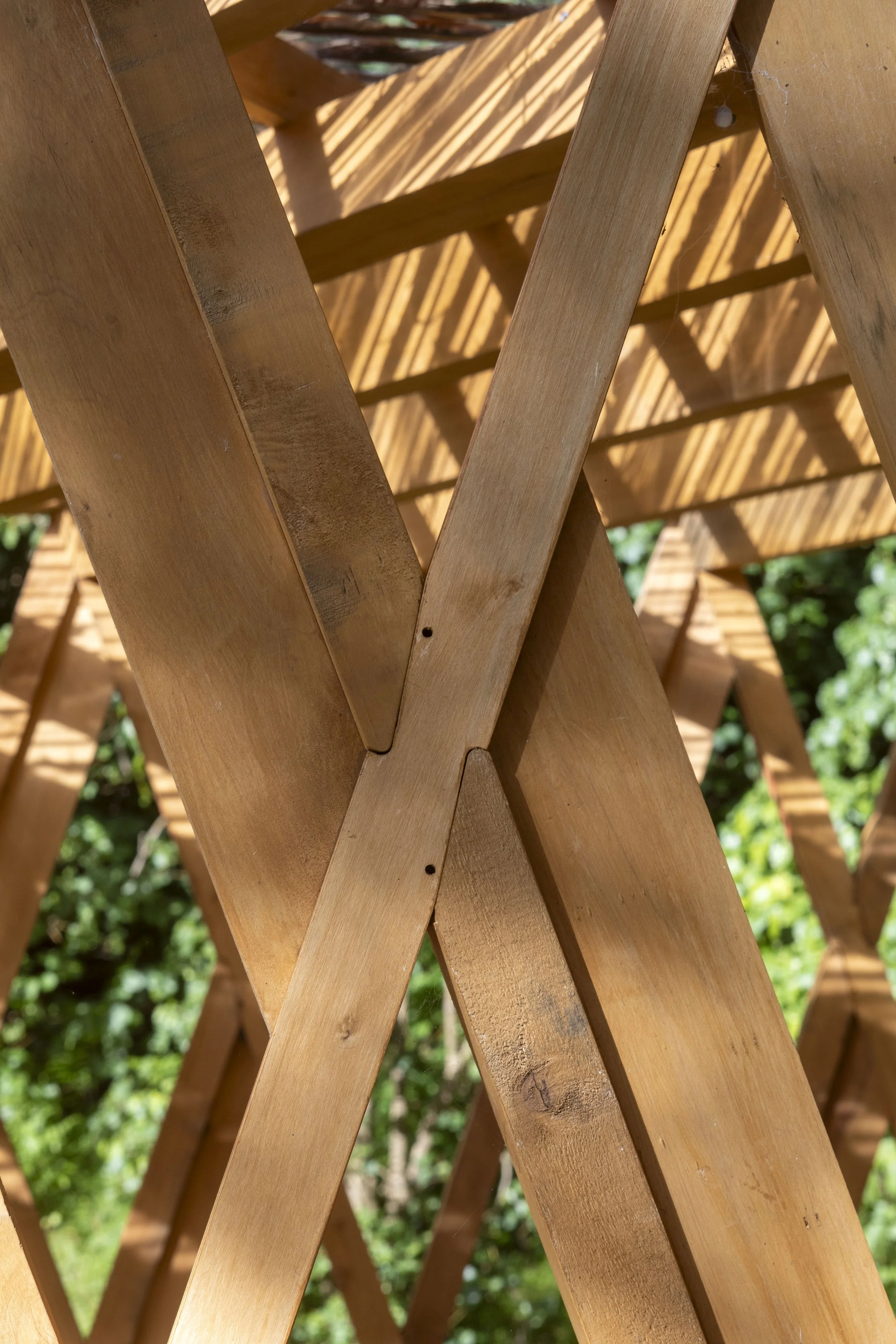 Earlier projects in the timber research structures work series used Abodo screening timber, which is light and very stable timber that facilitated very accurate milling. As with most digitally machined structures, they relied on very stable timbers (Abodo, natural hardwoods, CLT, LVL) that are either expensive or not suitable for outdoor use. Lower quality timbers are problematic as the natural behavior of the timber—warping, twisting, shrinking—makes the required precision difficult to achieve. Our next step, therefore, was to further develop the technology to allow the combined use of unstable timber and precision machining, the next structure updated an ancient Japanese wedged joint technique to seamlessly absorb inaccuracies or deformation in the timber elements. The Timber Monogamy project extending this – there were no nails or screws fixings in the above-ground structure; only wedges. Alternatively, as a step towards reinvigorating unique Māori building technologies, another pavilion adapted the post-tensioned heavy timber construction of pre-colonial Māori whare. Where whare employed hand-adzed wall-beam joints and flax tensioning ropes, this structure combines digital milling and the standard agricultural wire fence strainers.